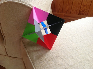 I also made this origami gyroscope. I think it turned out too big. I used a 4x4 square. Next time, I will be more mindful of the size. Another gripe about this book...they should suggest paper size. I do like the square cut out in the middle thoug...a window to the other side.