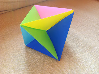 This octahedron was simple to make with six water bomb bases. The pieces slid together in about 20 minutes.